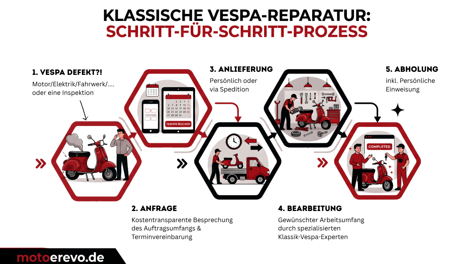 Wir führen eine perfekte Vespa PX200 Motorrevision ohne Kompromisse durch. Inkl. optischer Aufarbeitung.